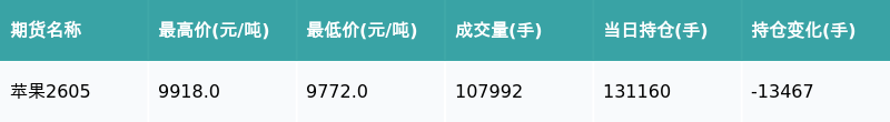 21智讯1月15日电,南财金融终端盘后期货数据显示,郑州商品交易所的苹果主力合约收跌0.88%,收盘报9807.0元/吨,日内资金流出3.01亿元。其他相关指标见下表: