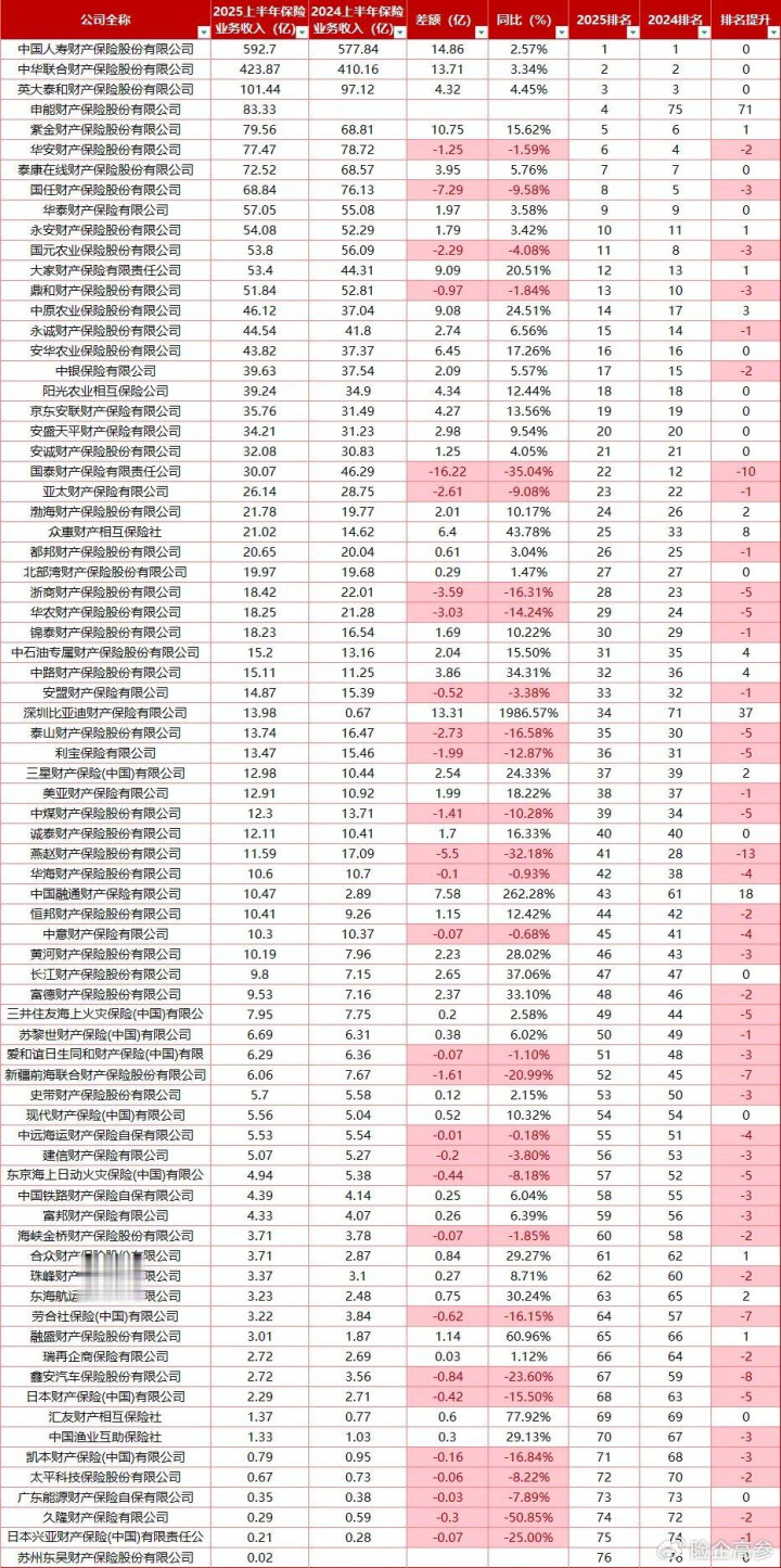 《险企高参》根据各司2025年二季度偿付能力报告统计,76家非上市财险机构合计保险业务收入约2594.91亿元,同比增长约7.48%。其中,45家机构正增长,29家机构负增长(申能财险、东吴财险无同比数据)。