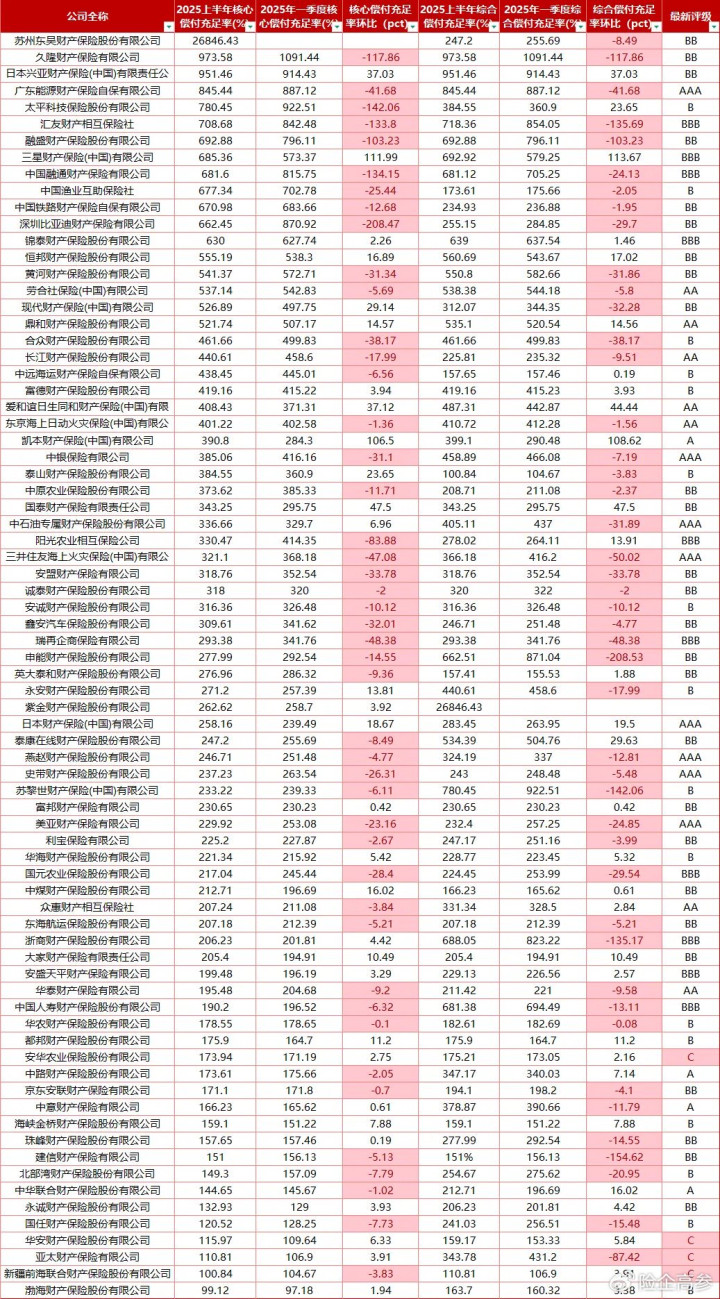 2025年上半年财险机构核心偿付能力充足率普遍承压,比亚迪财险以208.47个百分点的行业最大环比降幅居首。建信财险、太平科技核心指标分别下滑154.62和142.06个百分点,分列降幅榜第二、三位。