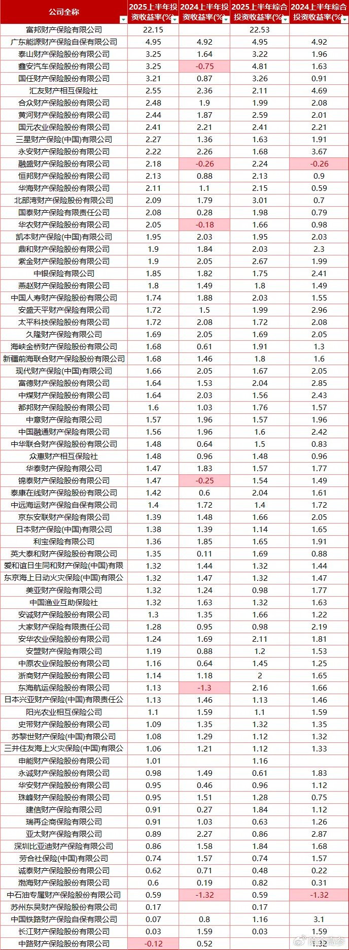 国元农业保险、三星财产保险中国有限公司分别录得2.41%与2.27%,永安财产保险则以2.22%结束头部阵营。融盛财产保险、恒邦财产保险等十余家机构收益率集中在2.18%至1.3%区间,其中鼎和财产保险与紫金财产保险以1.9%持平收尾。值得注意的是,中路财产保险成为榜单唯一负收益机构,投资回报率为-0.12%。