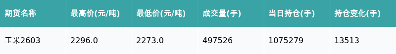21智讯1月15日电,南财金融终端盘后期货数据显示,大连商品交易所的玉米主力合约收涨0.83%,收盘报2295.0元/吨,日内资金流入7760.61万元。其他相关指标见下表: